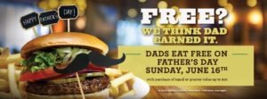 Dads eat free on Father’s Day, with purchase of equal or greater value (up to $10)