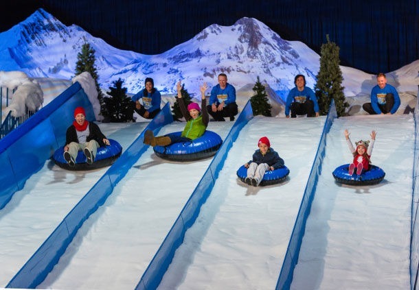 Children and adults can enjoy the wintery landscape of this fantastical snowy world by gliding downhill on six snow-tubing slides.