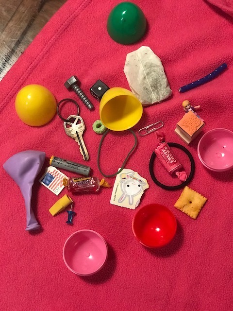 - Assortment of 20 or more items that can be placed into an average size Easter egg (Stamp, paper clip, coin, gum, toothpick, corn kernel, etc)