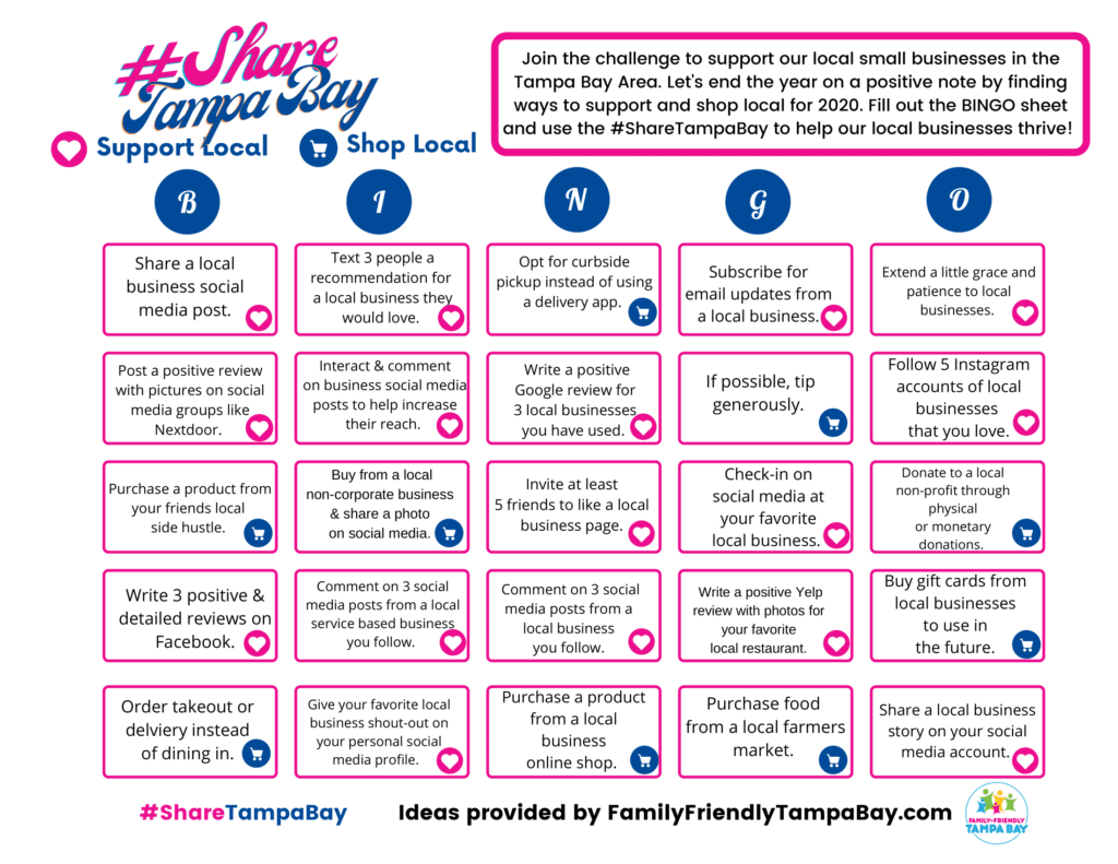Use #ShareTampaBay on social media to record your efforts so that we can spread our love for our Tampa Bay Area businesses. The more we collectively share, the more others can learn about these local businesses to help them thrive.